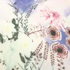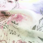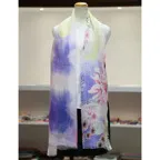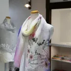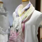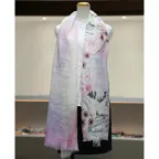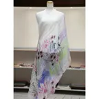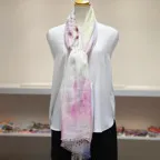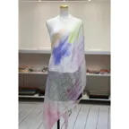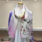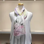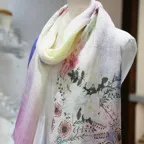 淡く透明感のある色使いとデザイン性の高いアシンメトリーモチーフが描かれた他にはないリネンストール。纏うだけで全体の印象を大きく変えてくれます。