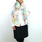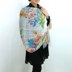 大判サイズのストールで肩から羽織る使い方もできます。春夏の日除けや室内の冷房対策としても使いやすくなっています。