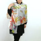 大判サイズのストールで肩から羽織る使い方もできます。春夏の日除けや室内の冷房対策としても使いやすくなっています。