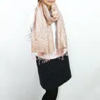 スタンダートな大判サイズで巻いても羽織っても、どちらも使いやすいタイプです。特に羽織は全体の印象がパッと華やかに、エレガントな雰囲気に変化します。