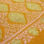このカシミヤストールには最も繊細なインドカシミール地方ラダック産カシミア糸(パシュミナ)が使われています。そのため手織りカシミヤストールの中でも最も目が細く繊細な生地となっています。薄くて軽くてやわらかい最上級の一枚です。