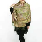 スタンダートな大判サイズで巻いても羽織っても、どちらも使いやすいタイプです。特に羽織は全体の印象がパッと華やかに、エレガントな雰囲気に変化します。