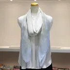 生地の向こうに透けるトップスや素肌が美しく見える、まるでメイクの仕上げに使うパウダーのようなストール。程よいハリ感があり、肌に付かず離れずの質感になっています。絶妙なボリューム感と美しいシルエットも他とは違う大きな魅力です。