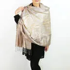 スタンダートな大判サイズで巻いても羽織っても、どちらも使いやすいタイプです。特に羽織は全体の印象がパッと華やかに、エレガントな雰囲気に変化します。