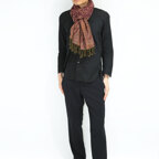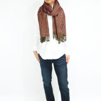 スタンダードな大判サイズで、首に巻くことはもちろん、室内でのひざ掛けにも、肩から羽織る使い方もできます。特に羽織りは、パッと華やかにエレガントな雰囲気に変わります。上半身を覆えるので、着ている服を気にせず合わせることができます。忙しい朝もコーディネートを気にする必要はありません。
