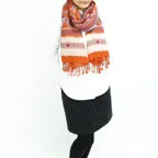 スタンダードな大判サイズで、首に巻くことはもちろん、室内でのひざ掛けにも、肩から羽織る使い方もできます。特に羽織りは、パッと華やかにエレガントな雰囲気に変わります。上半身を覆えるので、着ている服を気にせず合わせることができます。忙しい朝もコーディネートを気にする必要はありません。
