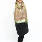 スタンダートな大判サイズで巻いても羽織っても、どちらも使いやすいタイプです。特に羽織は全体の印象がパッと華やかに、エレガントな雰囲気に変化します。