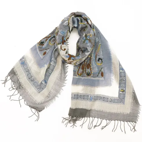 透け感のある生地に施された立体感のある刺繍が美しく、装いのアクセントに最適です。特にカジュアルな装いと相性がよくなっています。