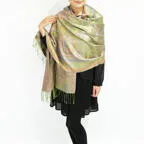 スタンダートな大判サイズで巻いても羽織っても、どちらも使いやすいタイプです。特に羽織は全体の印象がパッと華やかに、エレガントな雰囲気に変化します。