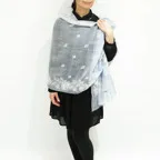 薄手のコットンシルク生地に施されたバランスの良い刺繍。これらの特徴が相まって優しい肌触りと程よいハリ感を実現。どんな巻き方、羽織り方をしてもシルエットが決まりやすくなっています。