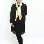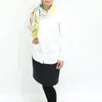 スクエアサイズで、アスコットタイのようにシャツやブラウスの中におさめて使うこともできます。室内でも巻いたままでいられるので使いやすくなっています。