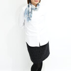 小ぶりなスクエアサイズで、アスコットタイのようにシャツやブラウスの中におさめて使うこともできます。室内でも巻いたままでいられるので使いやすくなっています。