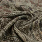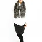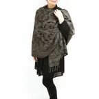 スタンダードな大判サイズで、首に巻くことはもちろん、室内でのひざ掛けにも、肩から羽織る使い方もできます。特に羽織りは、パッと華やかにエレガントな雰囲気に変わります。上半身を覆えるので、着ている服を気にせず合わせることができます。忙しい朝もコーディネートを気にする必要はありません。