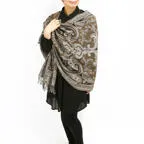 スタンダードな大判サイズで、首に巻くことはもちろん、室内でのひざ掛けにも、肩から羽織る使い方もできます。特に羽織りは、パッと華やかにエレガントな雰囲気に変わります。上半身を覆えるので、着ている服を気にせず合わせることができます。忙しい朝もコーディネートを気にする必要はありません。