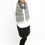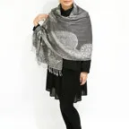 スタンダードな大判サイズで、首に巻くことはもちろん、室内でのひざ掛けにも、肩から羽織る使い方もできます。特に羽織りは、パッと華やかにエレガントな雰囲気に変わります。上半身を覆えるので、着ている服を気にせず合わせることができます。忙しい朝もコーディネートを気にする必要はありません。