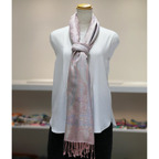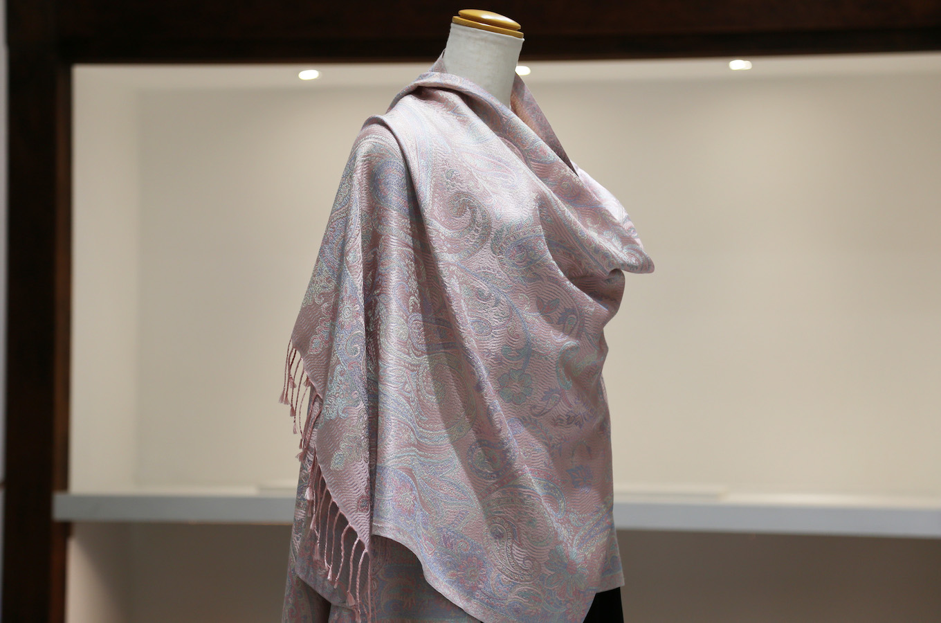 スタンダートな大判サイズで巻いても羽織っても、どちらも使いやすいタイプです。特に羽織は全体の印象がパッと華やかに、エレガントな雰囲気に変化します。