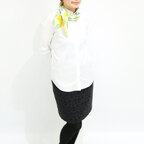 65cm×65cmの小判スカーフで、アスコットタイのようにシャツやブラウスの中におさめて使うこともできます。室内でも巻いたままでいられるので使いやすくなっています。