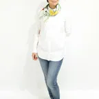 65cm×65cmの小判スカーフで、アスコットタイのようにシャツやブラウスの中におさめて使うこともできます。室内でも巻いたままでいられるので使いやすくなっています。