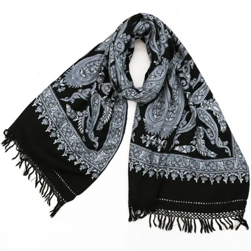 繊維一本一本がとても細い「スーパーファインウール」はうっとりするようなやわらかさと、ほのかな光沢が魅力。さらにこの生地にカシミール職人による芸術的な手刺繍を施した贅沢な一枚です。
