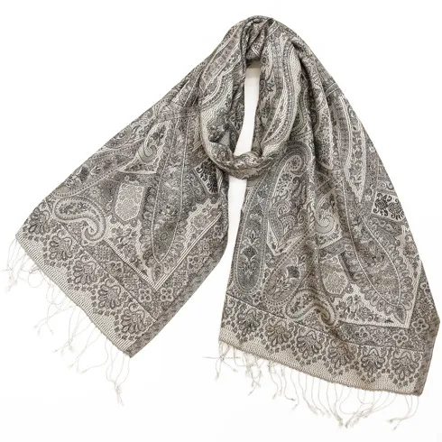 このストールは、カジュアルからフォーマルまで、どんなシーンにもマッチします。ディテールはダイヤモンドのように美しい織り柄で、遠目にも高級感を醸し出します。