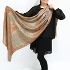 このカシミヤストールには最も繊細なインドカシミール地方ラダック産カシミヤ糸(パシュミナ)が使われています。そのため手織りカシミアストールの中でも最も目が細く繊細な生地となっています。薄くて軽くてやわらかい最上級の一枚です。