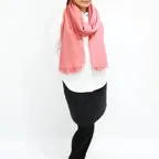 非常に大きなショールサイズで、広げて羽織れば上半身をすっぽりと覆うことができます。縦横の長さも十分にあるため、巻き方の自由度が広がります。程よいボリューム感と立体感を簡単につくることができるため、一巻きでこなれた印象になります。面積もあるので、真夏の室内での冷房対策や膝掛けとしても使いやすくなっています。