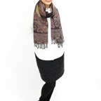 スタンダードな大判サイズで、首に巻くことはもちろん、室内でのひざ掛けにも、肩から羽織る使い方もできます。特に羽織りは、パッと華やかにエレガントな雰囲気に変わります。上半身を覆えるので、着ている服を気にせず合わせることができます。忙しい朝もコーディネートを気にする必要はありません。