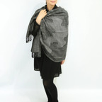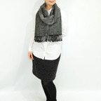 スタンダードな大判サイズで、首に巻くことはもちろん、室内でのひざ掛けにも、肩から羽織る使い方もできます。特に羽織りは、パッと華やかにエレガントな雰囲気に変わります。上半身を覆えるので、着ている服を気にせず合わせることができます。忙しい朝もコーディネートを気にする必要はありません。