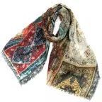 非常に大きなショールサイズで、広げて羽織れば上半身をすっぽりと覆うことができます。縦横の長さも十分にあるため、巻き方の自由度が広がります。程よいボリューム感と立体感を簡単につくることができるため、一巻きでこなれた印象になります。面積もあるので、真夏の室内での冷房対策や膝掛けとしても使いやすくなっています。