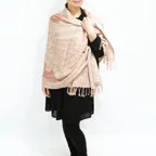 スタンダードな大判サイズで、首に巻くことはもちろん、室内でのひざ掛けにも、肩から羽織る使い方もできます。特に羽織りは、パッと華やかにエレガントな雰囲気に変わります。上半身を覆えるので、着ている服を気にせず合わせることができます。忙しい朝もコーディネートを気にする必要はありません。