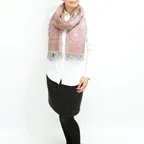 スタンダードな大判サイズで、首に巻くことはもちろん、室内でのひざ掛けにも、肩から羽織る使い方もできます。特に羽織りは、パッと華やかにエレガントな雰囲気に変わります。上半身を覆えるので、着ている服を気にせず合わせることができます。忙しい朝もコーディネートを気にする必要はありません。