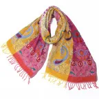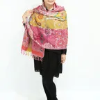 スタンダードな大判サイズで、首に巻くことはもちろん、室内でのひざ掛けにも、肩から羽織る使い方もできます。特に羽織りは、パッと華やかにエレガントな雰囲気に変わります。上半身を覆えるので、着ている服を気にせず合わせることができます。忙しい朝もコーディネートを気にする必要はありません。