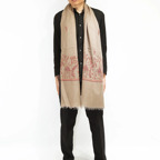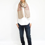 バランスの良い大判サイズで、巻きでも羽織でもどちらも使いやすいストールです。特に羽織は全面に施された刺繍が美しく輝き、サッとあしらうだけで全体の印象を大きく変えてくれます。