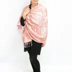 スタンダートな大判サイズで巻いても羽織っても、どちらも使いやすいタイプです。特に羽織は全体の印象がパッと華やかに、エレガントな雰囲気に変化します。