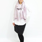 スタンダートな大判サイズで巻いても羽織っても、どちらも使いやすいタイプです。特に羽織は全体の印象がパッと華やかに、エレガントな雰囲気に変化します。