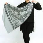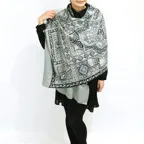 190cm×67cmのスタンダードな大判サイズで、巻きでも羽織でもどちらも使いやすいストールです。特に羽織は全面に施された刺繍が美しく輝き、サッとあしらうだけでエレガントな雰囲気に変化します。ドレスや着物などの羽織物としても重宝します。