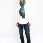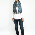 スタンダートな大判サイズで巻いても羽織っても、どちらも使いやすいタイプです。特に羽織は全体の印象がパッと華やかに、エレガントな雰囲気に変化します。