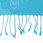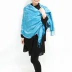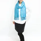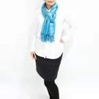 スタンダートな大判サイズで巻いても羽織っても、どちらも使いやすいタイプです。特に羽織は全体の印象がパッと華やかに、エレガントな雰囲気に変化します。
