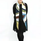 アーティスティックなデザインと発色の良さが際立つ一枚。シンプルに使うだけでアクセント効果が抜群のストールに仕上がっています。