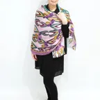 大判サイズのストールで肩から羽織る使い方もできます。春夏の日除けや室内の冷房対策としても使いやすくなっています。