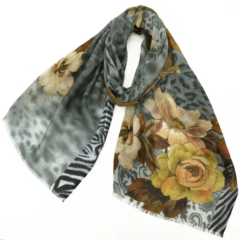 スタンダートな大判サイズで巻いても羽織っても、どちらも使いやすいタイプです。特に羽織は全体の印象がパッと華やかに、エレガントな雰囲気に変化します。