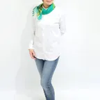 65cm×65cmの小判スカーフで、アスコットタイのようにシャツやブラウスの中におさめて使うこともできます。室内でも巻いたままでいられるので使いやすくなっています。