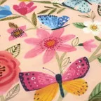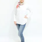 明るいオーラがあふれる華やかなデザイン。お顔周りを明るくしつつ多色使いで色々なお洋服とも相性も抜群の一枚です!