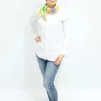 65cm×65cmの小判スカーフで、アスコットタイのようにシャツやブラウスの中におさめて使うこともできます。室内でも巻いたままでいられるので使いやすくなっています。