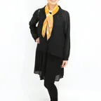 小ぶりなスクエアサイズで、アスコットタイのようにシャツやブラウスの中におさめて使うこともできます。室内でも巻いたままでいられるので使いやすくなっています。