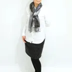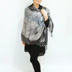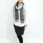 スタンダートな大判サイズで巻いても羽織っても、どちらも使いやすいタイプです。特に羽織は全体の印象がパッと華やかに、エレガントな雰囲気に変化します。
