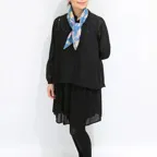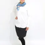 65cm×65cmの小判スカーフで、アスコットタイのようにシャツやブラウスの中におさめて使うこともできます。室内でも巻いたままでいられるので使いやすくなっています。