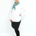 65cm×65cmの小判スカーフで、アスコットタイのようにシャツやブラウスの中におさめて使うこともできます。室内でも巻いたままでいられるので使いやすくなっています。