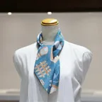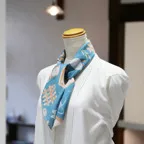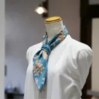 65cm×65cmの小判スカーフで、アスコットタイのようにシャツやブラウスの中におさめて使うこともできます。室内でも巻いたままでいられるので使いやすくなっています。