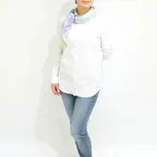 小ぶりなスクエアサイズで、アスコットタイのようにシャツやブラウスの中におさめて使うこともできます。室内でも巻いたままでいられるので使いやすくなっています。